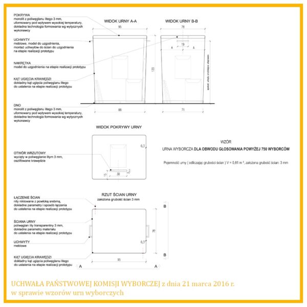 Urna została stworzona zgodnie z uchwałą Państwowej Komisji Wyborczej z dnia 21 marca 2016 r., spełniając wszystkie normy wymagane do przeprowadzania demokratycznych głosowań. Dzięki swojej solidnej konstrukcji, bezpieczeństwu oraz przejrzystości, jest doskonałym rozwiązaniem dla organizatorów wyborów.